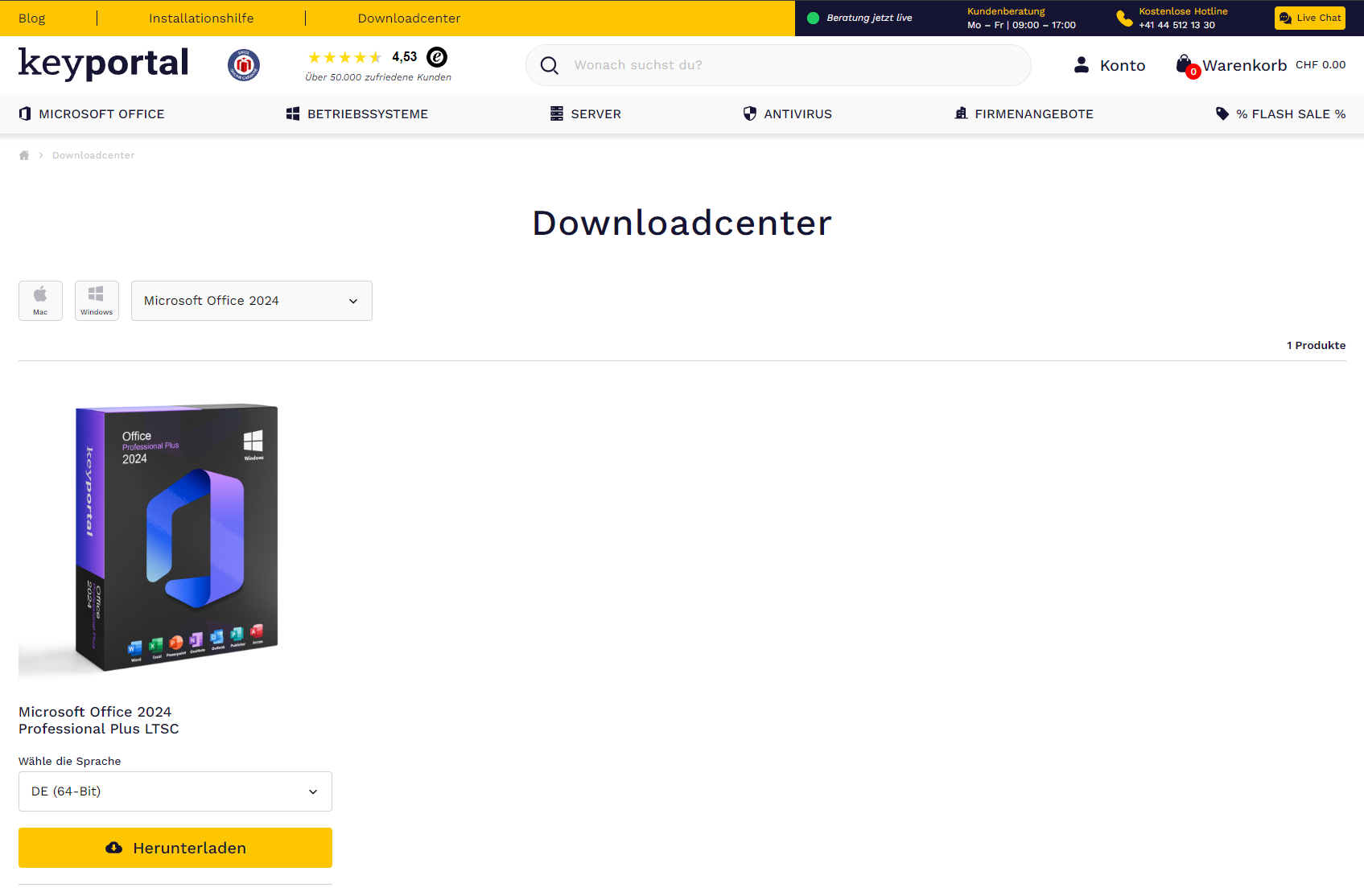 2. Lade das Produkt herunter indem du die passende Sprache & Version auswählst und dann auf «Herunterladen» klickst.