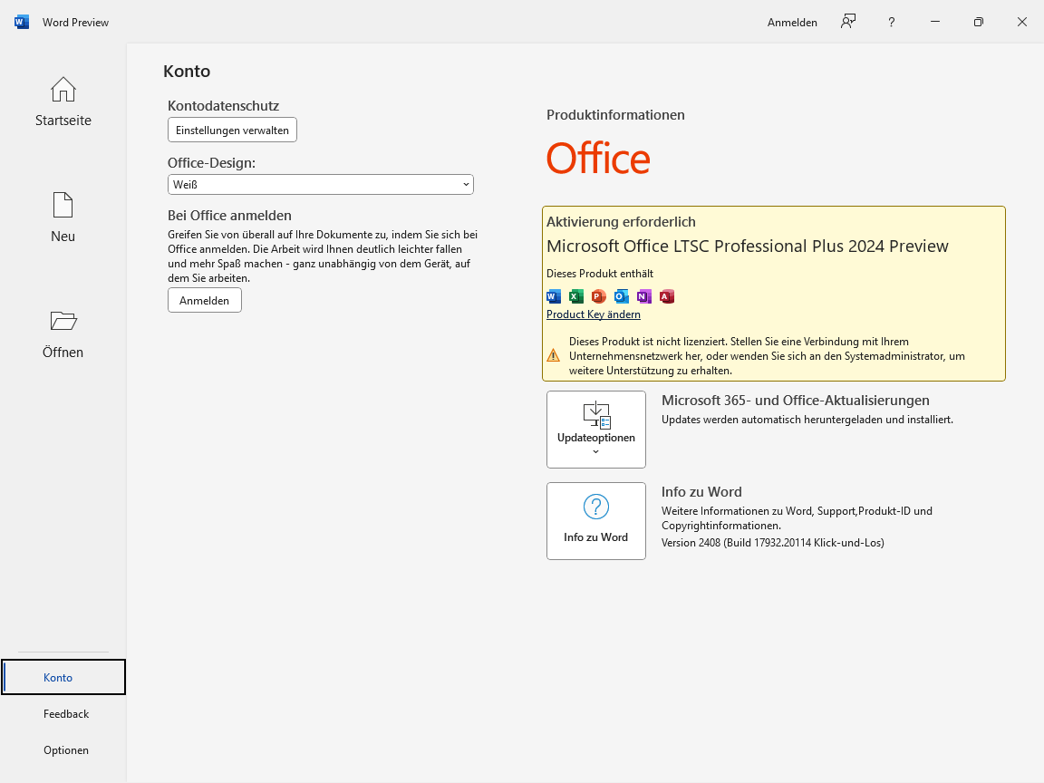Gehe anschließend auf der Startseite von Word auf ein leeres Dokument, dann oben links auf «Datei» und anschließend unten Links auf «Konto». Dort solltest du wie im folgenden Bild im gelben Bereich auf «Product Key ändern» klicken können. Wenn dieses Feld nicht angezeigt wird, starte Word nochmal neu.