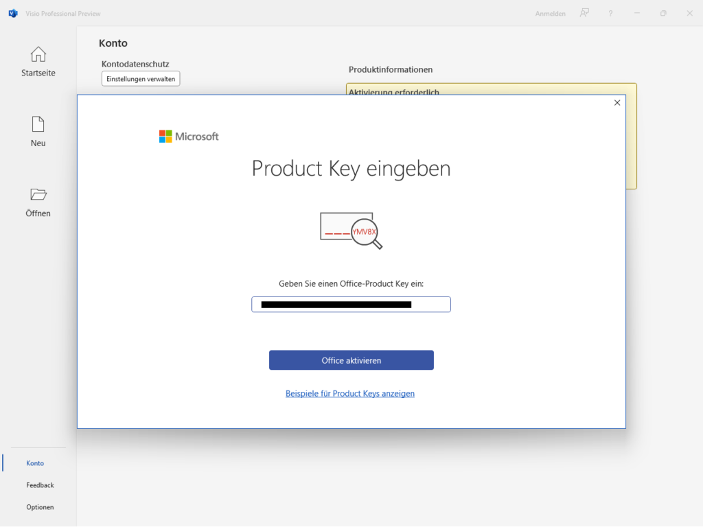 10. Danach öffnet sich dieses Feld für die Eingabe des Keys. Tippe den von uns per E-Mail erhaltenen Key ein und klicke auf das Feld «Office aktivieren».