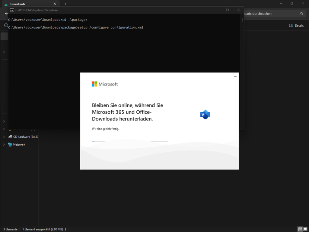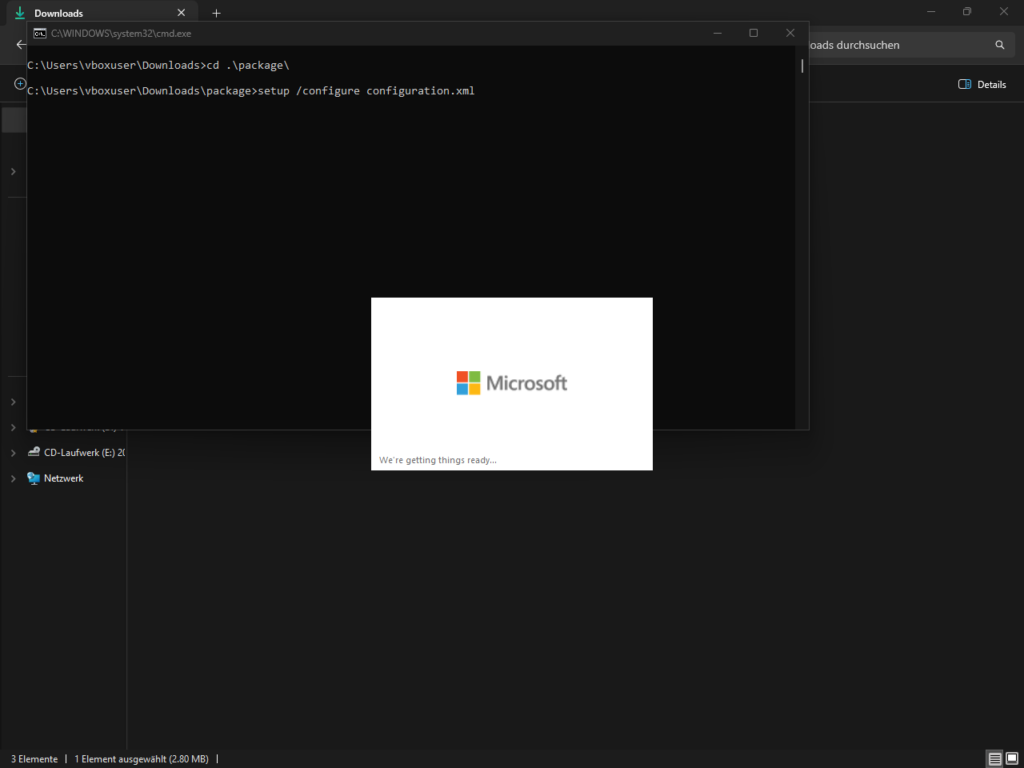 6. Nun startet das Setup ganz von alleine. Es öffnet sich ein dunkles Dialogfeld und das Microsoft Tool zeigt in der Mitte den Fortschritt der Installation an. Nun läuft der Download der Dateien.