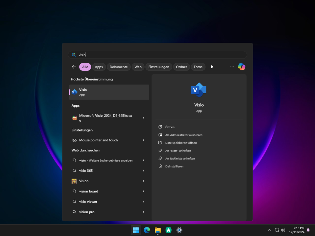 8. Nach dem Abschluss der Installation kannst du unten im Windows-Suchfeld nach «Visio» suchen und es öffnen.