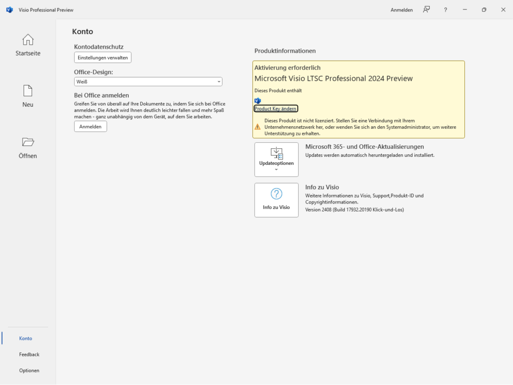 Gehe anschließend auf der Startseite von Visio unten Links auf «Konto». Dort solltest du wie im folgenden Bild im gelben Bereich auf «Product Key ändern» klicken können. Wenn dieses Feld nicht angezeigt wird, starte Word nochmal neu.