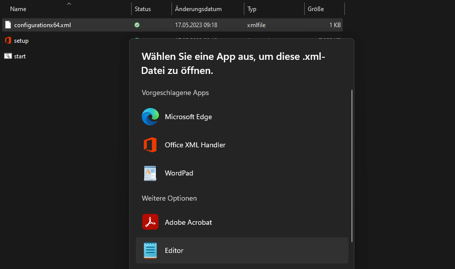 (Sollte Editor nicht vorgeschlagen werden wähle «andere App auswählen«, dann sollte der Editor erscheinen.)