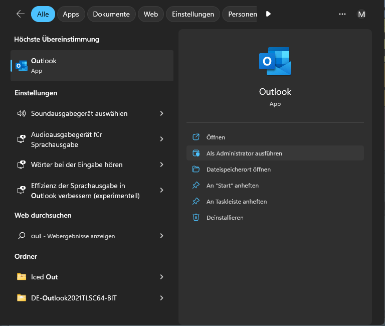 7. Gehe nach der Installation unten links ins Suchfeld und suche nach «Outlook». Starte die App.