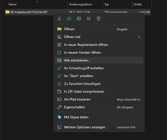 3. Um die Installation starten zu können musst du mit der rechten Maustaste auf den heruntergeladenen Zip-Ordner klicken und danach mit der linken Maustaste auf “Alle extrahieren” klicken.