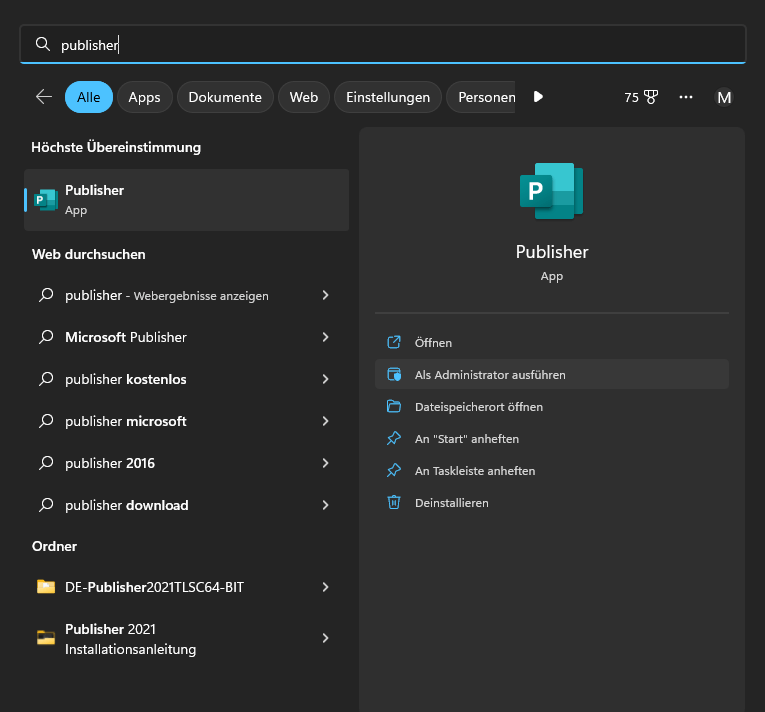 7. Gehe nach der Installation unten links ins Suchfeld und suche nach «Publisher». Starte die App.