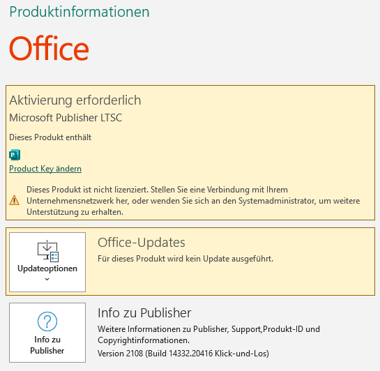 Gehe im Publisher oben links auf Datei –> Konto und dort kannst du auf «Product Key ändern» klicken. Tippe danach den von uns erhaltenen Key ein um dein Publisher 2021 zu aktivieren.